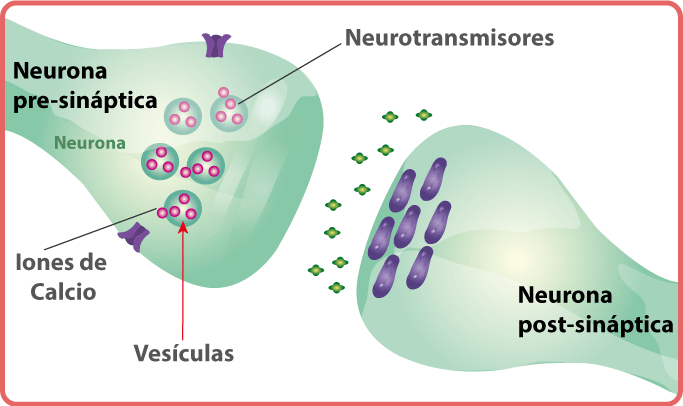 al llegar el otencial de accion, los canales de calcio dependen del voltaje, se abren las membranas y dejan entrar al calcio. Al entrar el calcio, hace que las vesiculas transmisoras se vayan a la membrana y asi mismo, los neurotransmisores son expulsados mediante exocitosis. La cantidad liberada del neurotransmisor es proporcional a la cantidad de calcio que entra en la terminal.